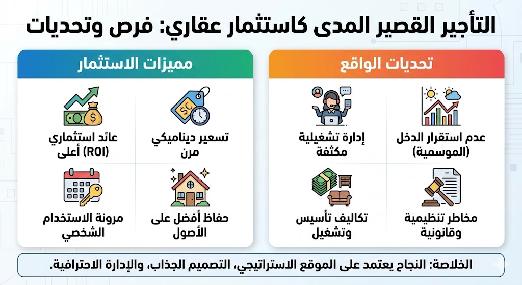 تتطلب إدارة التأجير القصير المدى جهداً أكبر مقارنة بالإيجار التقليدي. يحتاج المستثمر إلى إدارة الحجوزات، التواصل مع الضيوف، التنسيق مع خدمات التنظيف، ومتابعة الصيانة بشكل مستمر.